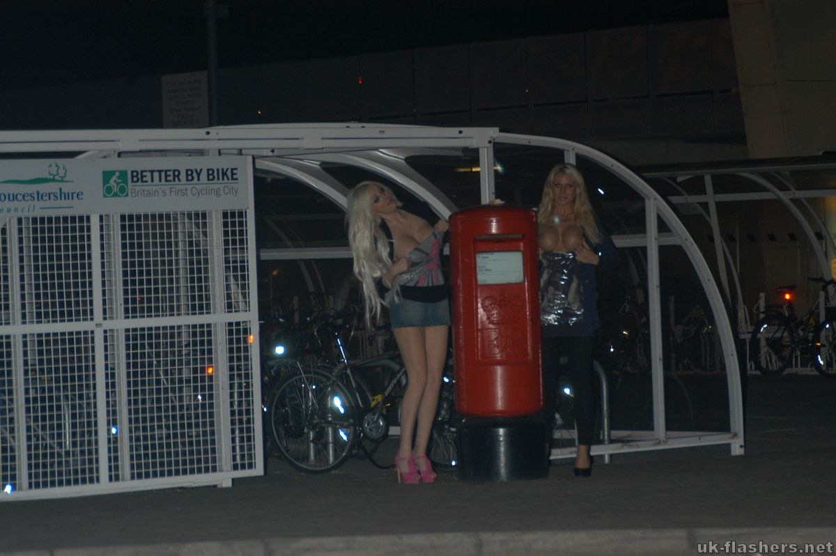Busty girls flashing of blonde british babes Chacha and Dolly outdoors in Bristol showing huge tits and displaying daring exhibitionism all over the downtown area. Both blonde cuties have giant udders and love to show them off in public when going on uk flashing tours round town. |